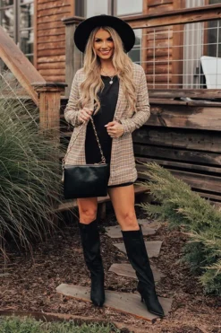 Welcome autumn fashionably with this gorgeous coat featuring a cute dark blush and natural hued plaid print, a hooded back, long loose sleeves, low accent pockets, and a relaxed open front silhouette that falls into a straight mid-thigh length hemline!