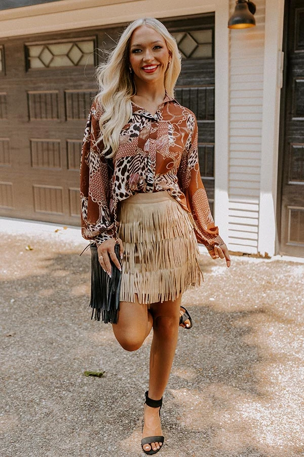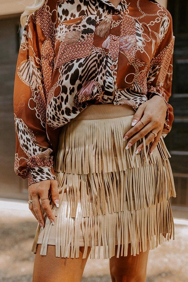 The perfect piece for twirling, our trendy gold ‘Country Road’ skirt featuring faux leather material with eye-catching fringe detailing, a high waistline, a side zip closure, and a flattering silhouette that ends in a straight mid-thigh length hemline!