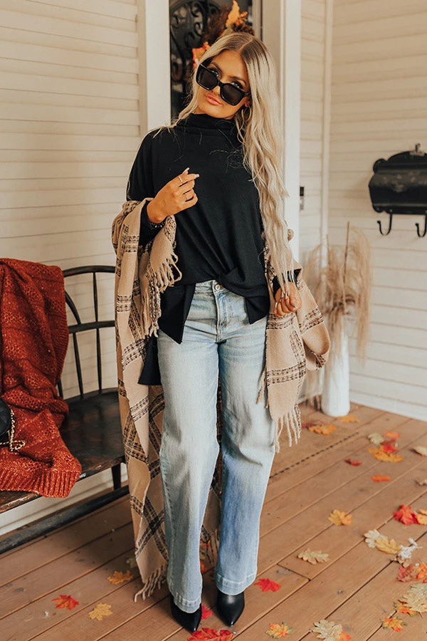 Lightweight but soft and warm tightly knitted poncho, natural, black and brown hued plaid print with oversized open side sleeves, and a silhouette that falls into a straight mid-thigh length hemline with fringe trim detailing.