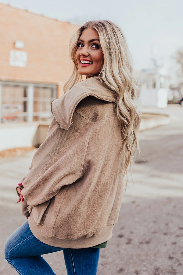 You are guaranteed to feel cozy when you layer up with this trendy iced latte colored jacket featuring corduroy accents, a zip closure fornt with a collared neckline, long loose sleeves with with fitted cuffs and thumb holes, low accent pockets with flap closures, and an ultra slouched silhouette that ends in a straight hemline!