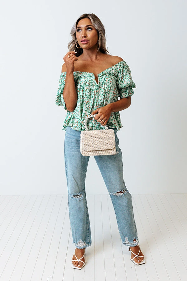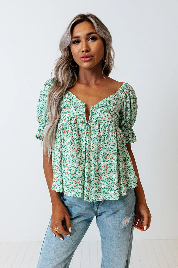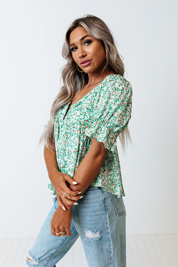 Slay all day in our pretty mint colored ‘Downtown Dallas Top’ featuring lightweight material patterned with a dainty floral print, a wide v-cut neckline with a notched accent, short puff sleeves with subtly flared cuffs, and a relaxed silhouette that falls into a straight hemline! on products