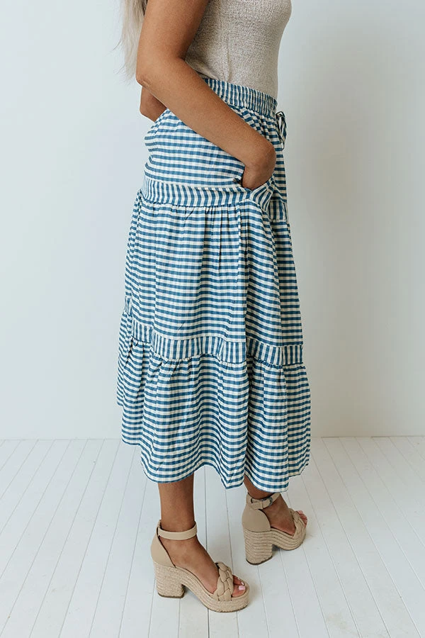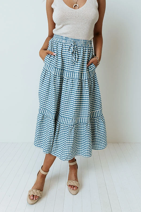 There is no better way to look put together on the weekend than with our charming ‘Farmers Market Meetup’ skirt featuring lightweight material patterned with a blue and white gingham print, an elastic waistline with a tie closure, and a relaxed tiered silhouette that falls into a straight mid-calf length hemline!