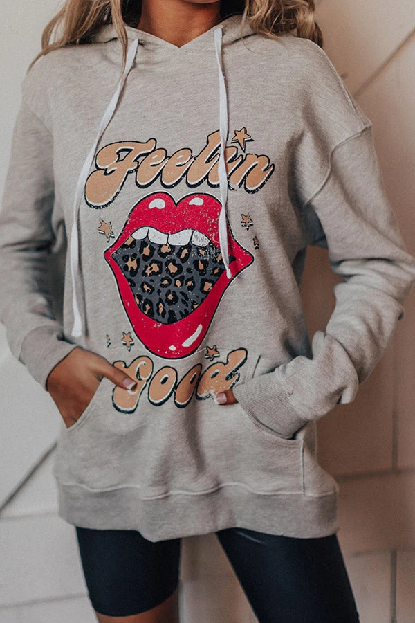 You will undoubtedly be “feelin’ good” when you wear this light grey hoodie featuring soft lightweight material, a high rounded neckline, a hooded back with a draw string closure, long loose sleeves with fitted cuffs, a large kangaroo front pouch, an adorable leopard and lips front graphic, and a relaxed silhouette that falls into a straight tunic length hemline! You can dress this adorable piece down with some biker shorts and trendy sneakers, or you can style it up by wearing it with some distressed light wash ankle skinnies, our red “Hadid Faux Suede Bootie,” our red “Going On Tour Wool Hat,” and “The Real Deal Faux Leather Tote in Tan!”