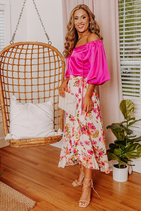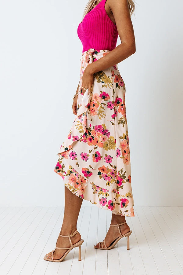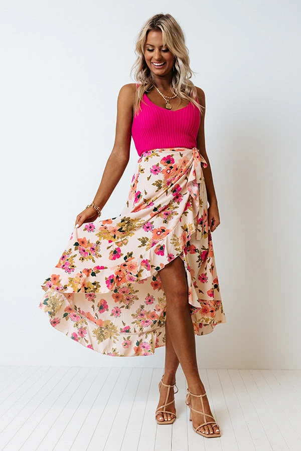 Show up and show out in our beautiful ‘Floral Paradise’ skirt featuring lightweight material patterned with a bold fuchsia, peach, and olive green hued floral print, a high waistline with a side tie closure, and a flattering wrap silhouette that ends in a mid-calf length tulip hemline! on products