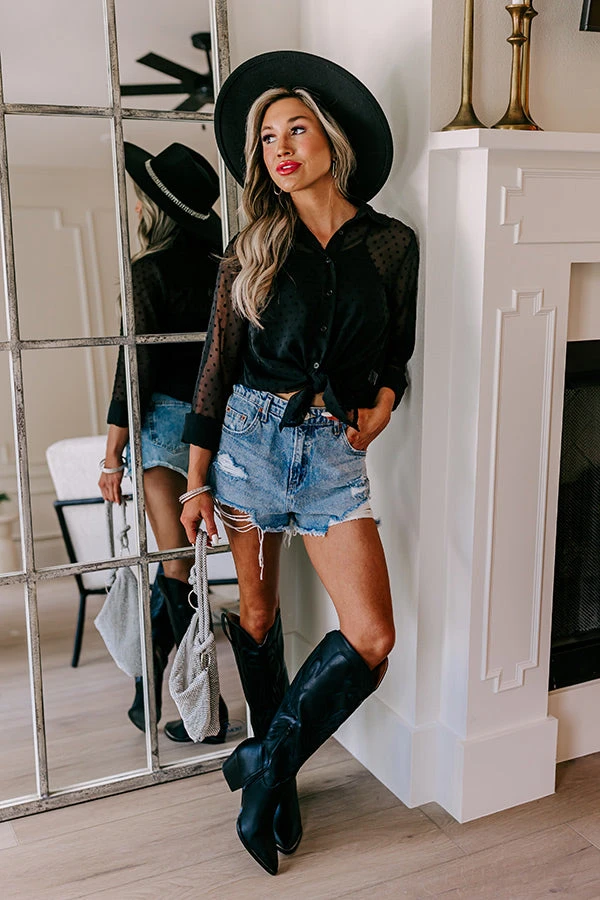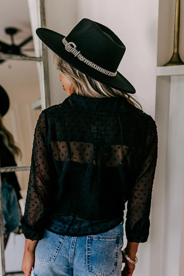 Stay chic in our flirty black ‘Hollywood Premier’ top featuring ultra lightweight semi-sheer chiffon material with tiny polka dot texturing, a button up front with a collared neckline, long loose sleeves with button closure cuffs, and a relaxed silhouette that falls into a rounded hemline!
