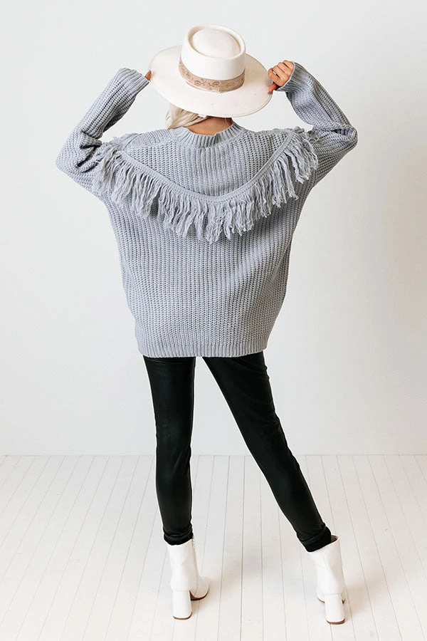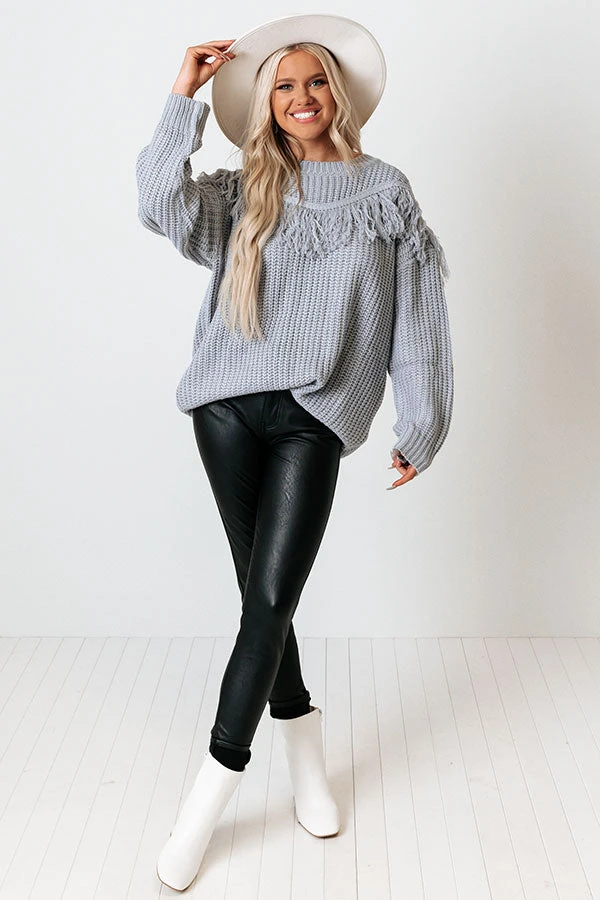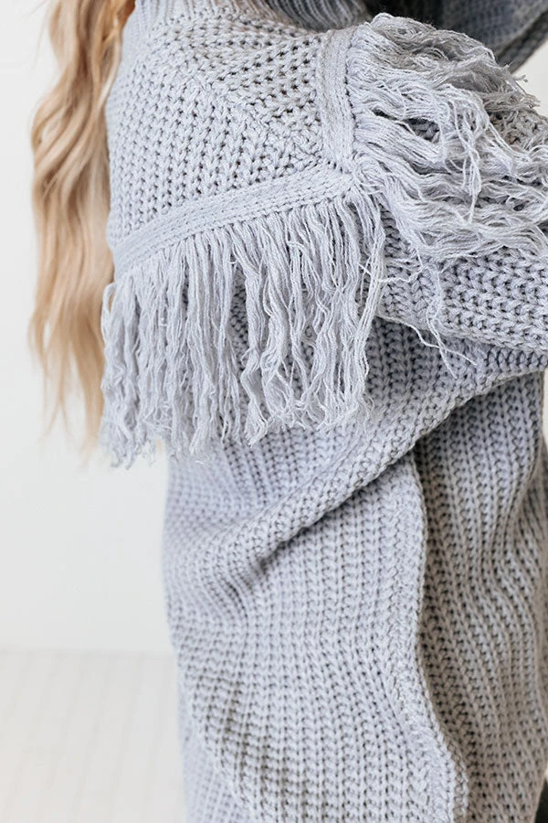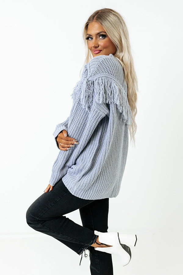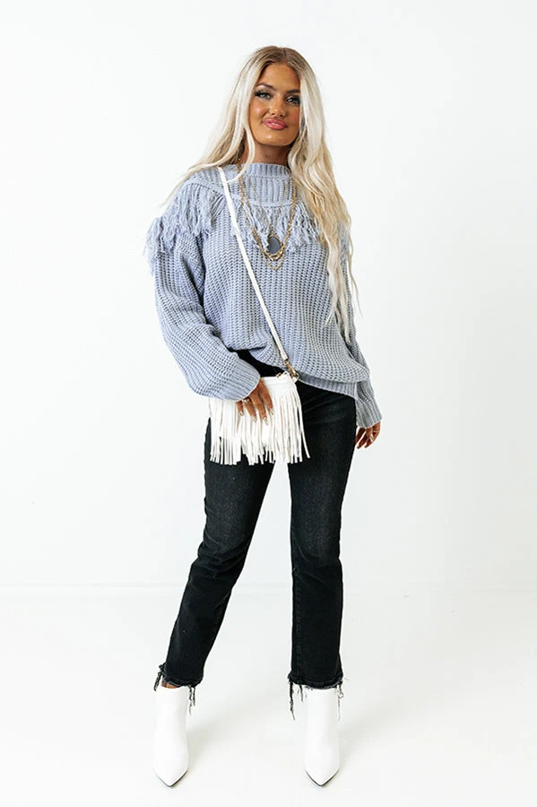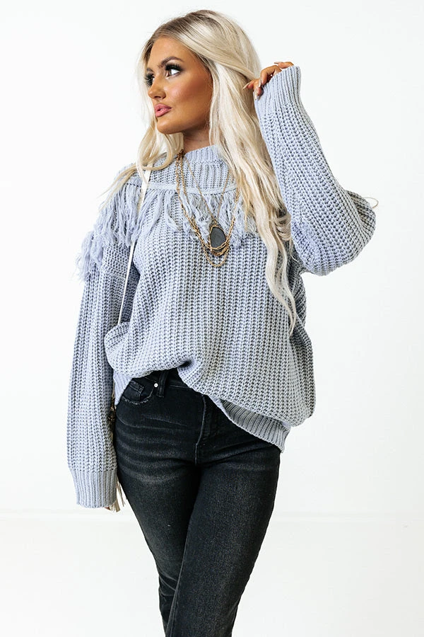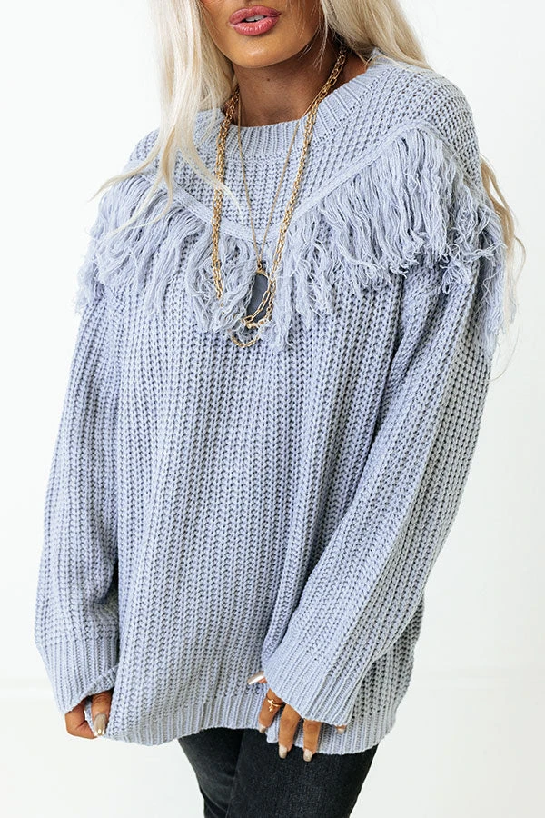 Make a fun statement with our adorable airy blue ‘Idlewild’ sweater featuring soft and warm knit material with fringe detailing around the bodice and upper arms, a rounded neckline, long loose sleeves, and a slouched silhouette that falls into a straight hemline!