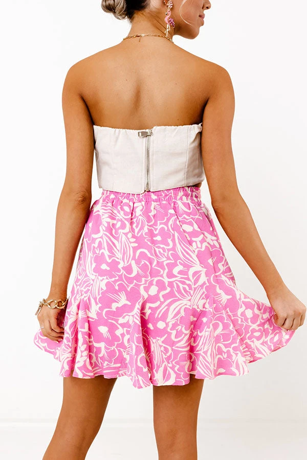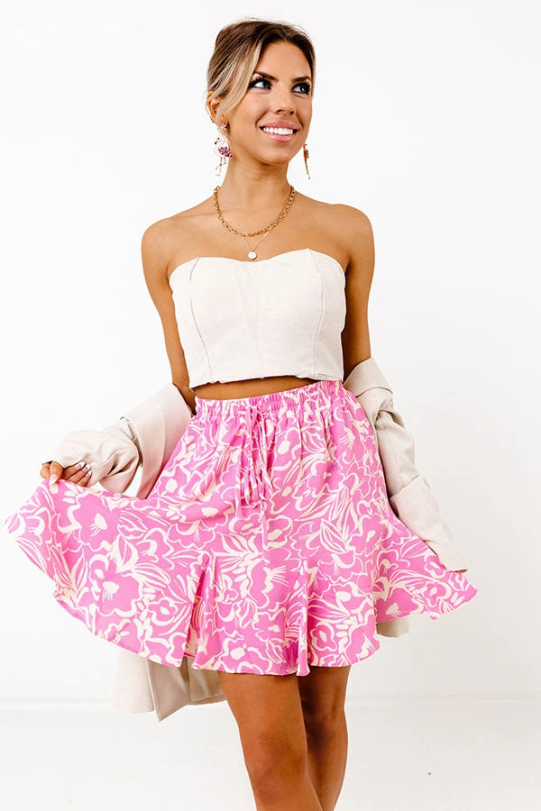 When in doubt…wear pink! This luxe skirt features lightweight breezy material patterned with dreamy white floral print, an elastic waistline with a tie closure, and a relaxed silhouette that falls into a ruffled mid-thigh length hemline!