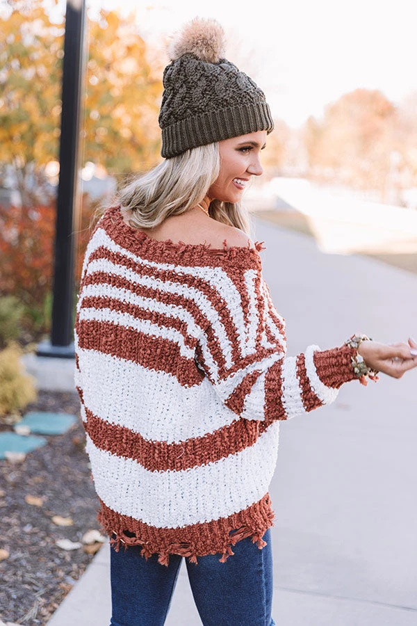 Meetup with your best girl friends looking FABULOUS in this adorable sweater featuring soft lightweight tight knit material with vertical ribbed texturing, white and dark rust hued accent stripes, a wide v-cut neckline that can be worn off one shoulder, long loose sleeves with fitted cuffs, and a slouched silhouette that falls into a distressed hemline!