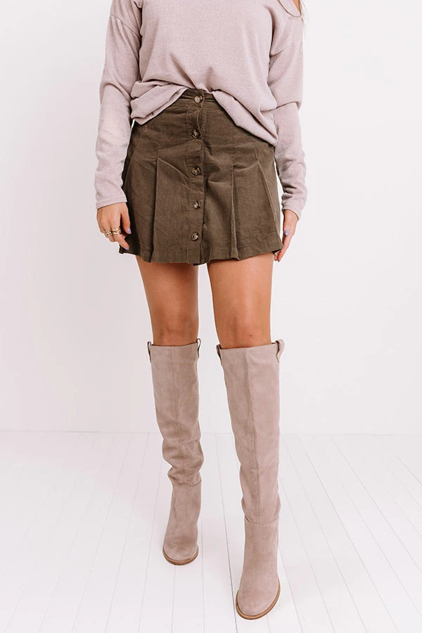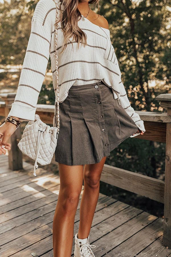 We have no doubt you’ll want to wear this sweet little espresso colored skirt now and later with its lightweight felt like material, button down front, higher waistline, and flattering pleated silhouette that falls into a straight flared upper-thigh length hemline!