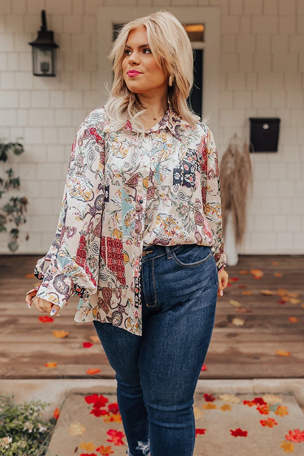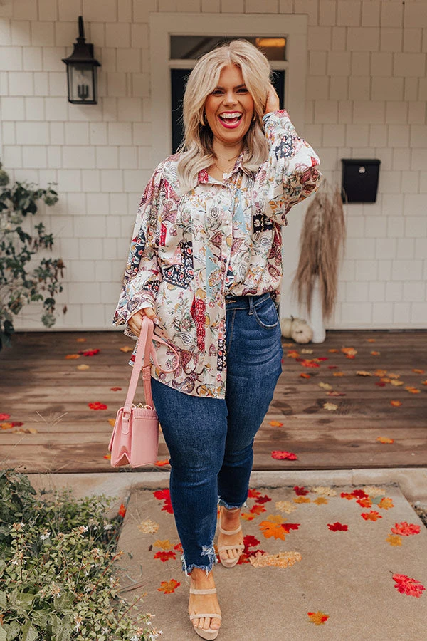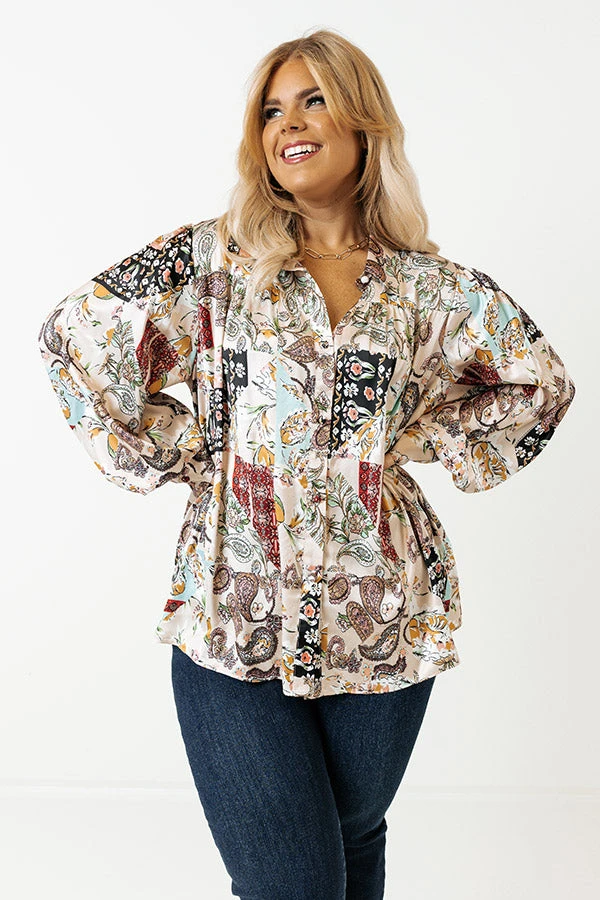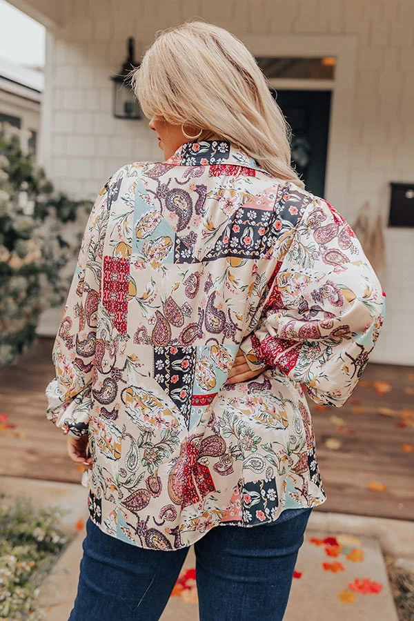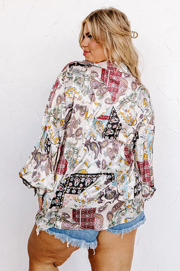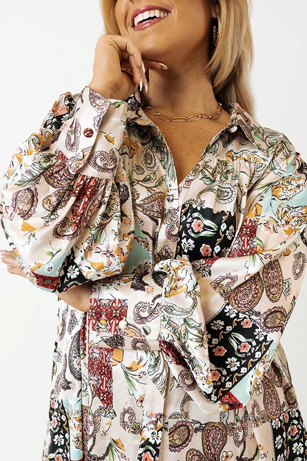 End getting dressed on a high note with this eye-catching top featuring lightweight satin material patterned with a variety of intricate prints, a button down front with a collared neckline, long loose sleeves with button closure cuffs, and a relaxed silhouette that falls into a straight hemline!