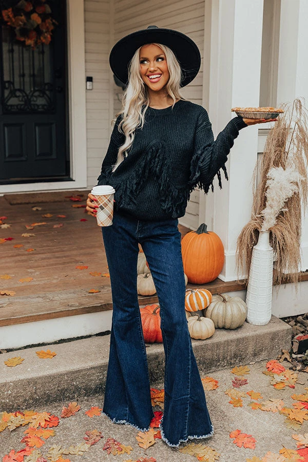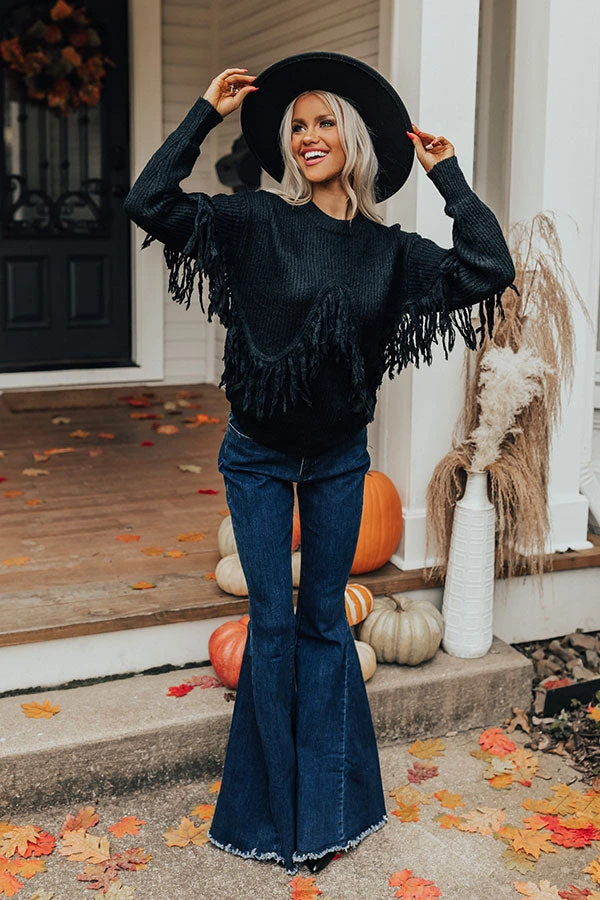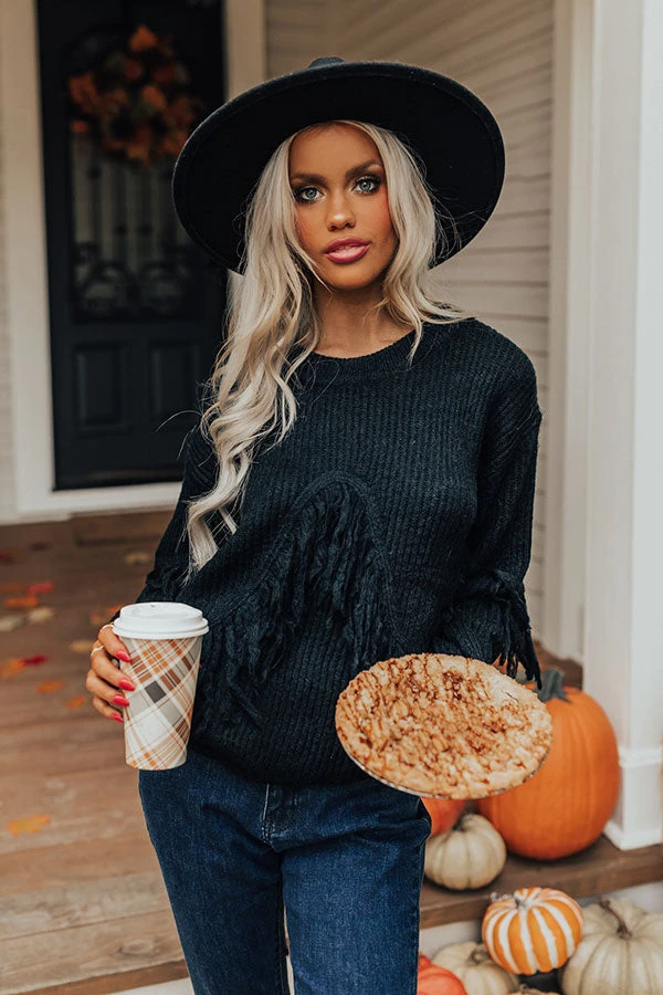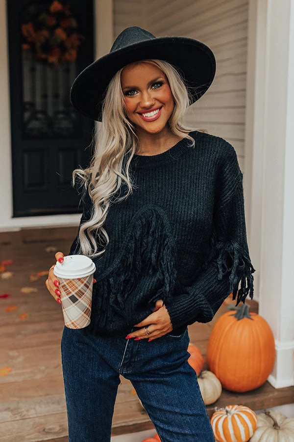 This black ribbed sweater features fringe detailing across the front and on the sleeves.