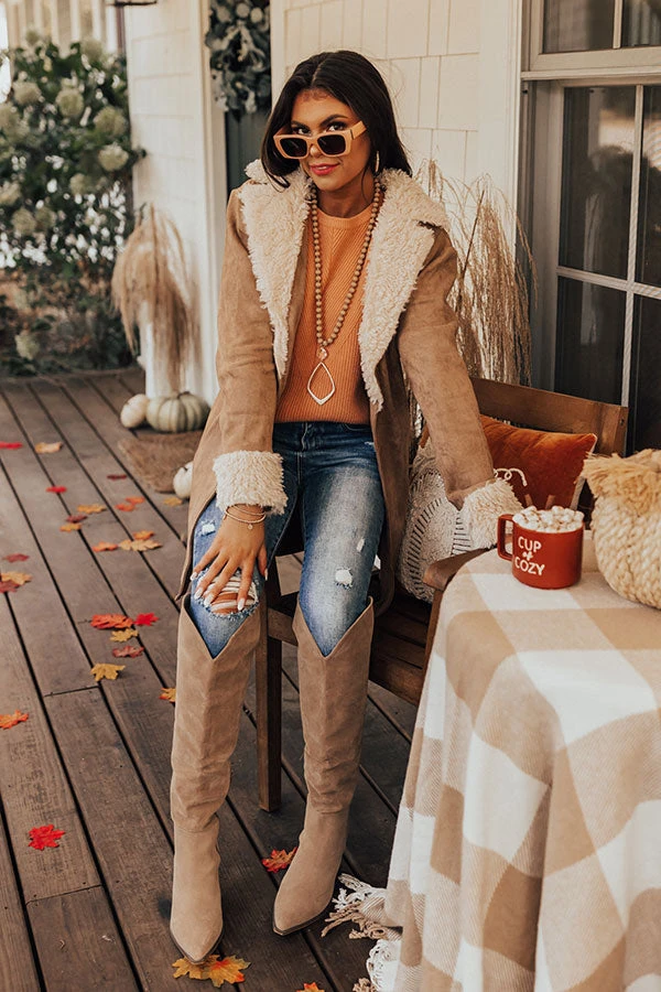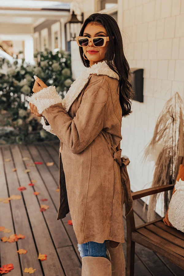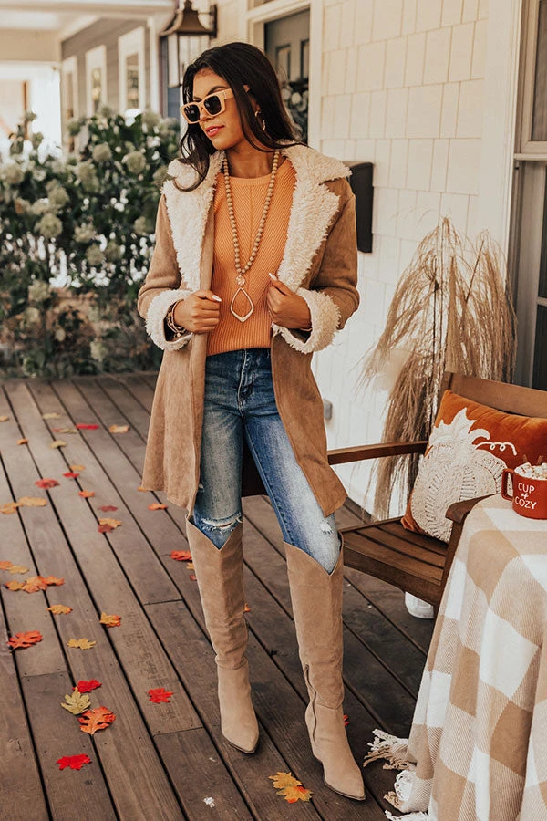 We’re falling for the ‘Salem Snuggles’ coat this season! Features khaki colored faux suede material, trendy oversized collar with cream faux fur detail, open front with belt tie closure, long relaxed fitting sleeves with cream faux fur cuffs, and a flattering silhouette that falls into a straight mid-thigh length hemline.