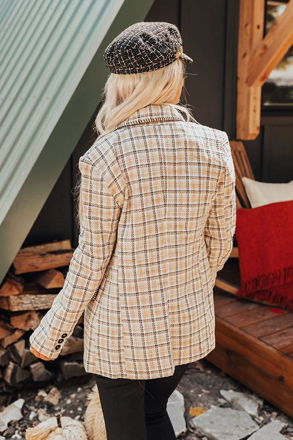 This chic statement blazer is a must-have for any girl boss closet! Features a plaid patterned tweed material with a color pallet of khaki, black, white, sky blue, yellow and orange hues with gold thread accents throughout, collared neckline with black thread accent, four button front closure, functional side pockets with flap closure and black thread accent, long loose sleeves with button closure, and a flattering silhouette that falls into a straight hemline.