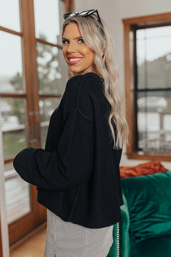 This simple but stylish black sweater features soft knit material, a rounded neckline, long loose sleeves, and a slouched silhouette that falls into a straight cropped hemline!