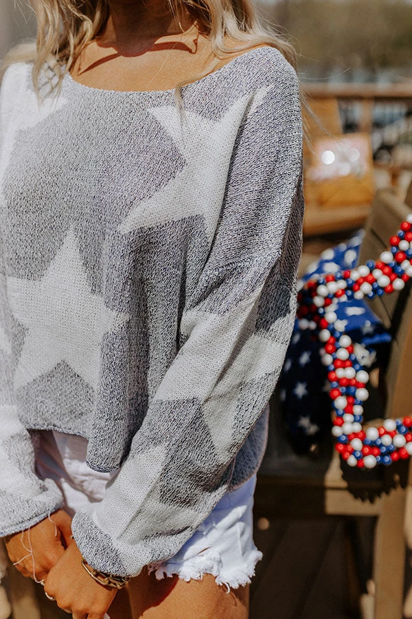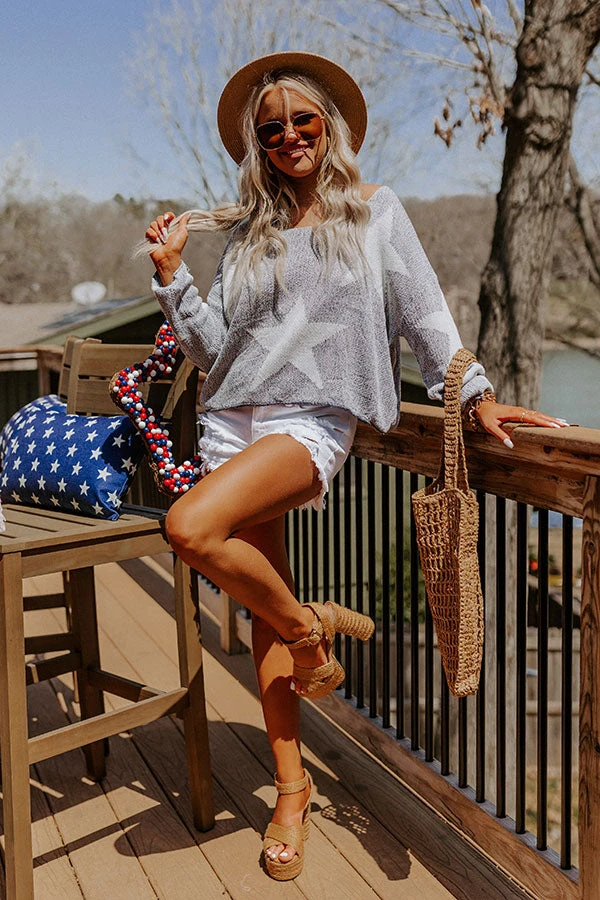 Transition into summer effortlessly in our cute navy ‘Star Spangles Kisses’ sweater featuring soft lightweight knit material patterned with large white stars, a scooped neckline, long loose sleeves, and a slouched silhouette that falls into a straight hemline! on products