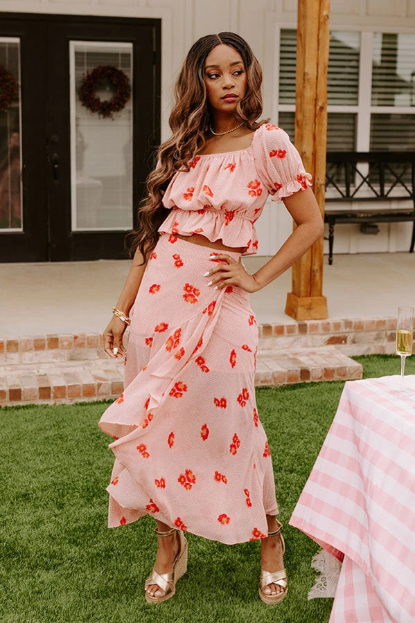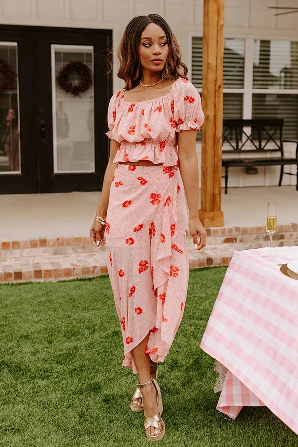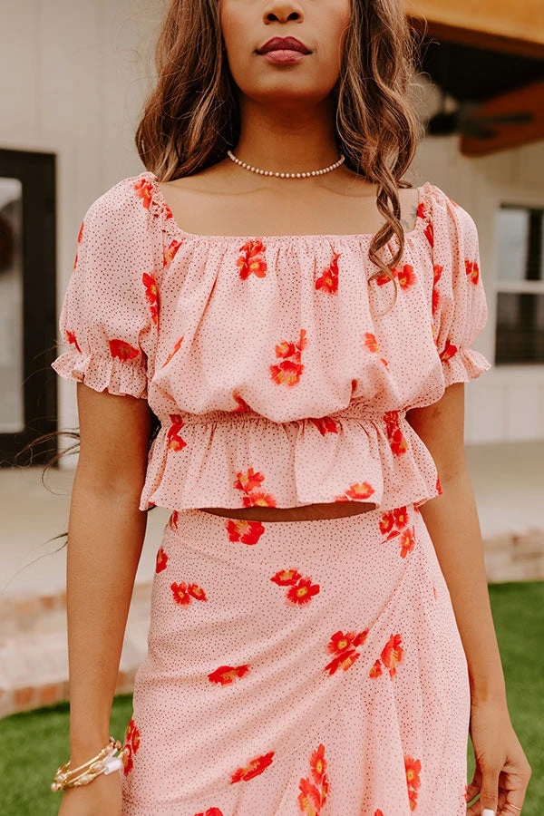Our adorable rose quartz hued ‘Stealing Hearts’ top features lightweight breezy material patterned with a coral/red hued floral print, a straight neckline, short puff sleeves that can be worn on- or off-shoulder, and a slouched silhouette that ends in a short cropped peplum hemline!