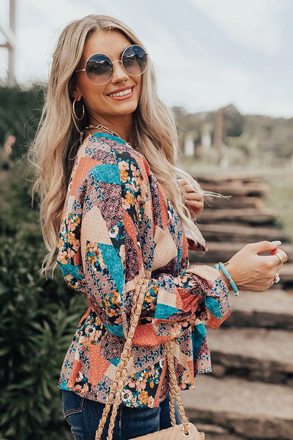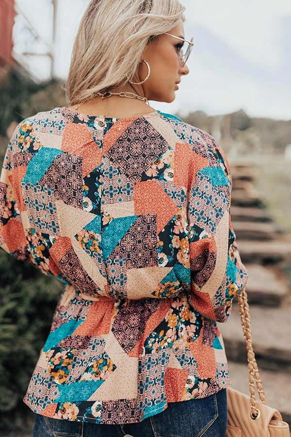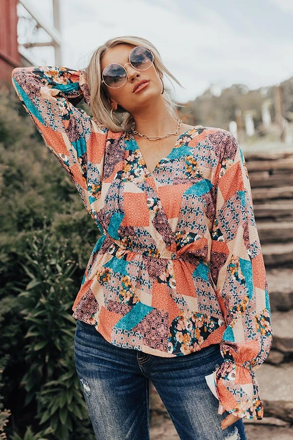 Take on the world in style with this eye-catching top featuring lightweight material patterned with unique rust and teal hued patchwork patterns, long bishop sleeves with flared cuffs, a faux wrap bodice with a v-cut neckline, a cinched waistline, and a relaxed silhouette that ends in a straight peplum hemline!