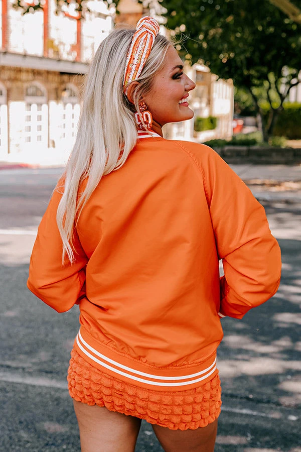 – Sleek, fully lined material in an orange hue with ivory hued accent stripes at the neckline, wrists, and waistline