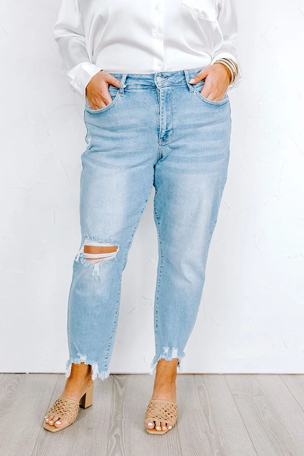 – Light wash, stretchy denim material with accent fading and distressed detail