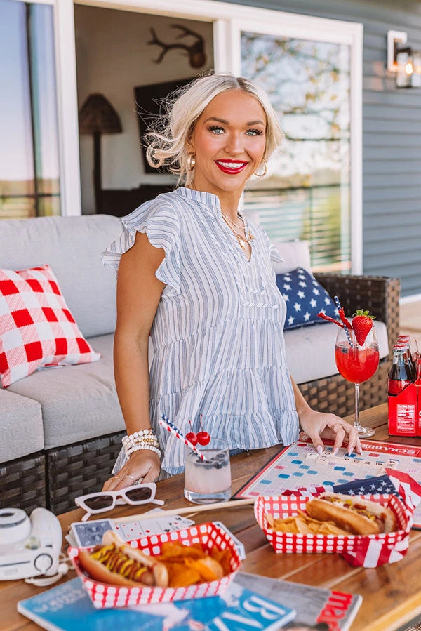 Show up and show out in our charming ‘Real Fling Shift Top’ featuring lightweight material patterned with vertical blue accent stripes, a rounded neckline with a v-notch, ruffled cap sleeves, and a relaxed tiered silhouette that falls into an uneven hemline! on products