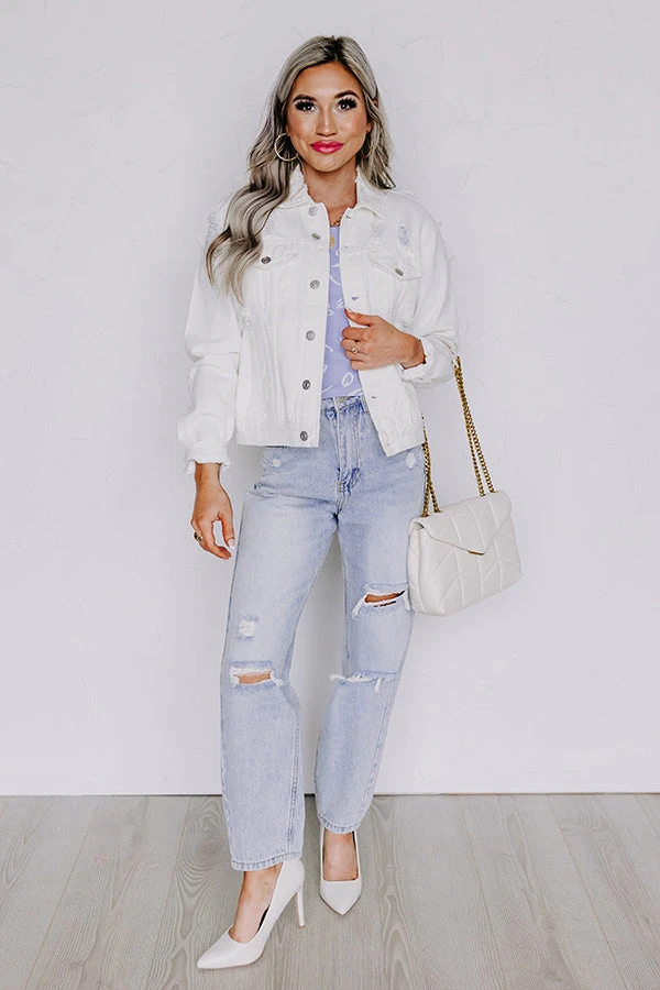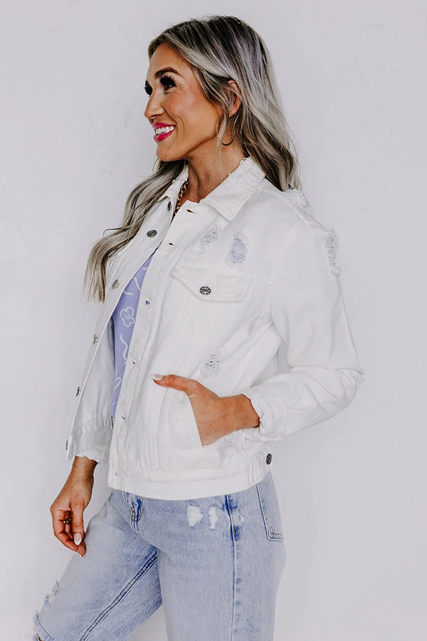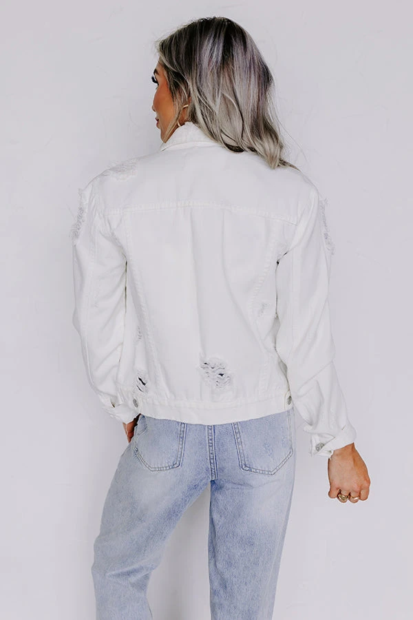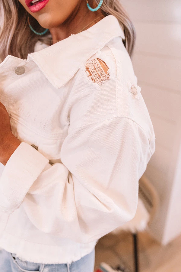 Your seasonal outfits will be envied when you complete your look with our white “Ronan” denim jacket featuring a rounded collar, two accent pockets and two accent side pockets, distressed detailing, a relaxed bodice with a straight frayed hip length hem, a button up front, medium wash color, and long sleeves that can be rolled! You can wear this trendy piece with a camisole or summer dress underneath or you can put it over a fall blouse to add some edginess to your pristine transitional style!