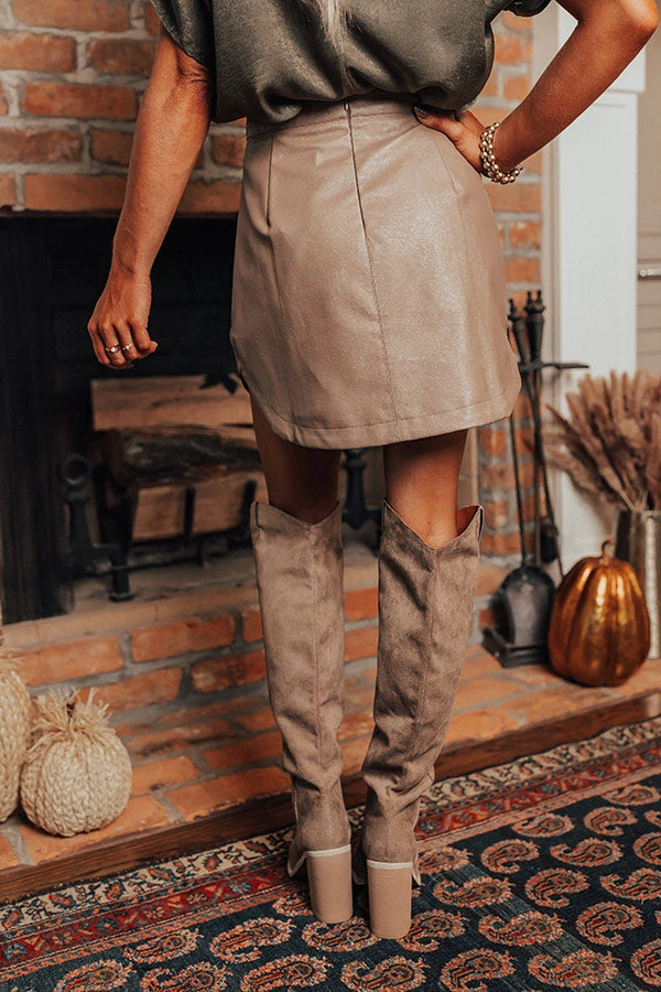 Heads are guaranteed to turn your way when you complete your look with our edgy taupe colored ‘Tobi’ skirt featuring sleek faux leather material, a wide waistband, and a flattering silhouette that ends in a rounded upper-thigh length hemline!