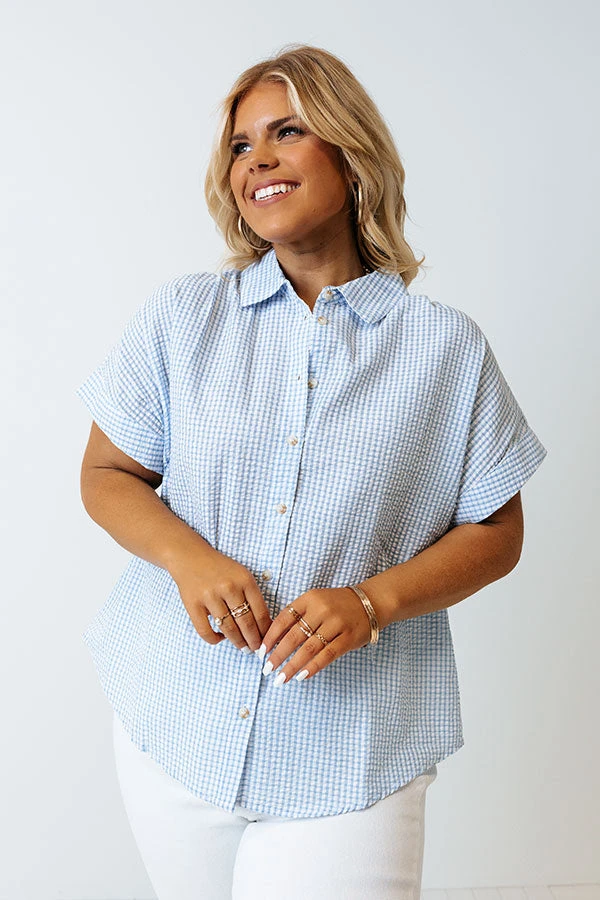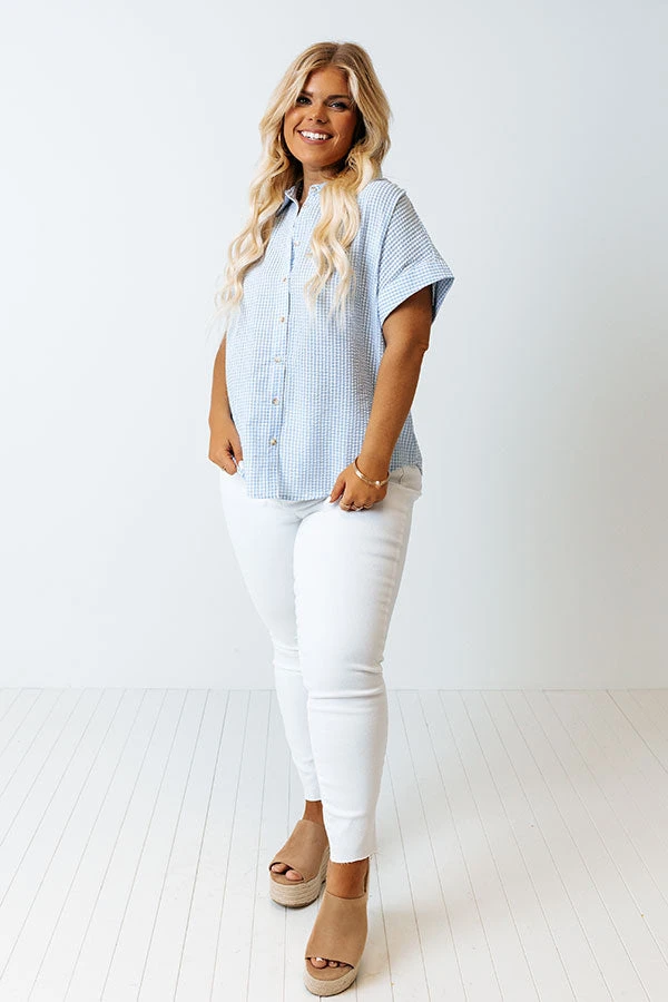 Keep your look classy in our timeless ‘Travel Life’ top featuring lightweight material patterned with vertical blue pinstripes, a button down front with a collared neckline, short sleeves, and a relaxed silhouette that falls into a rounded hemline! on products