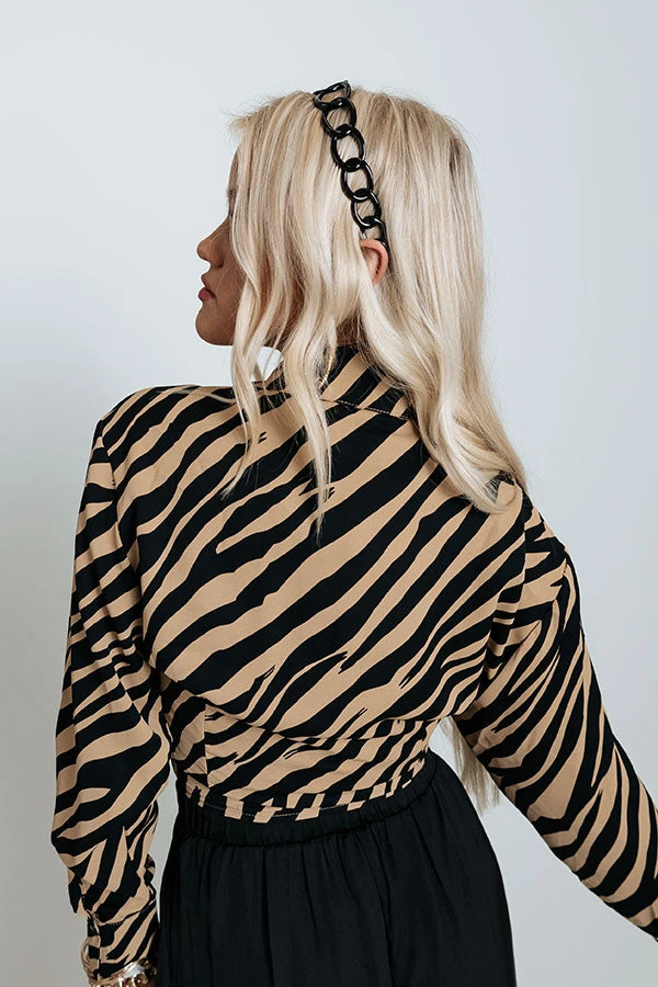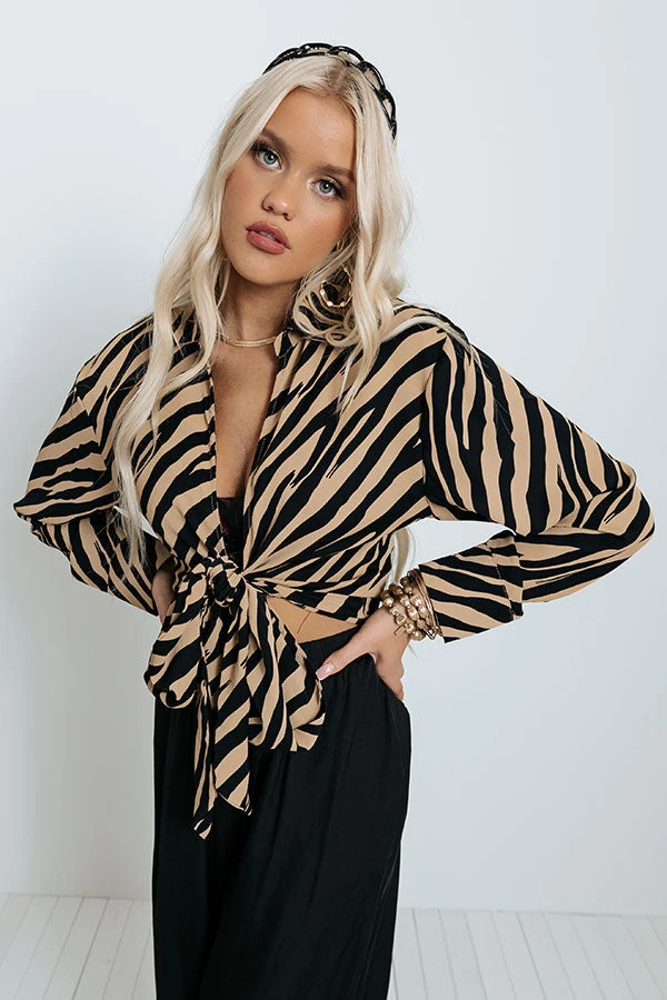 You will be an absolute beauty in this eye-catching top featuring lightweight material patterned with a black and natural hued zebra print, long loose sleeves with button closure, a deep collared v-cut neckline, and a flattering silhouette that ends in a tie closure hemline!